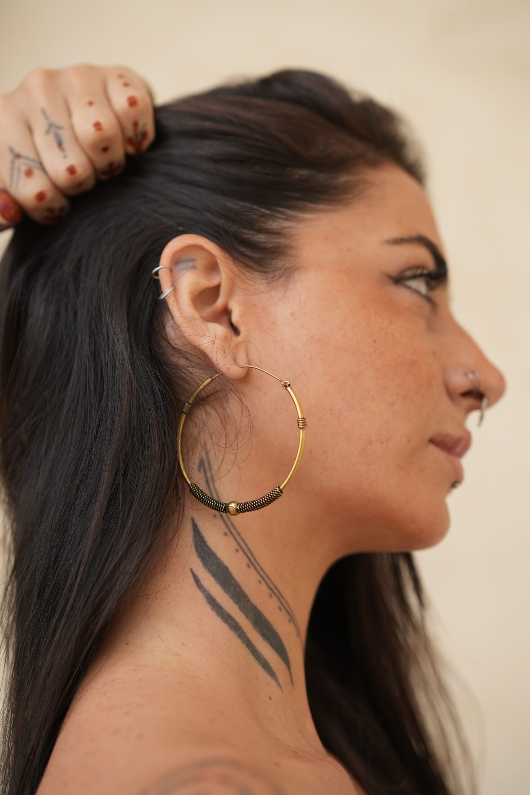 Brinco de argola grande com detalhes. Disponível no dourado (latão) e no prateado (latão banhado a prata).