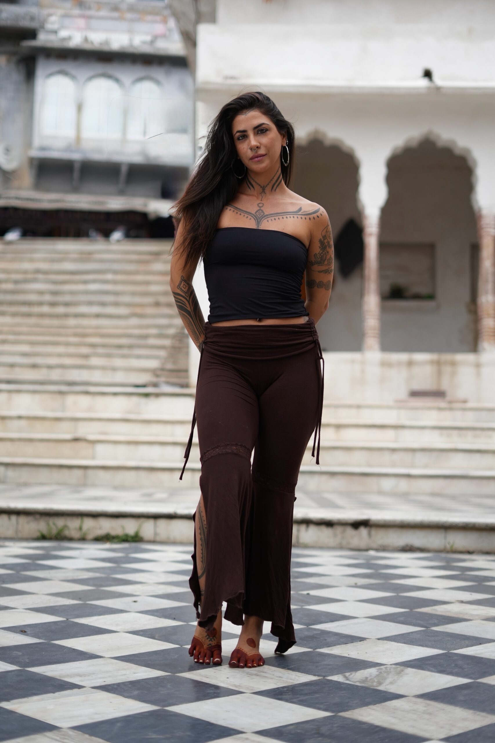 Calça flare com detalhe em renda e fenda, disponível no marrom e no preto. Tamanho único.
