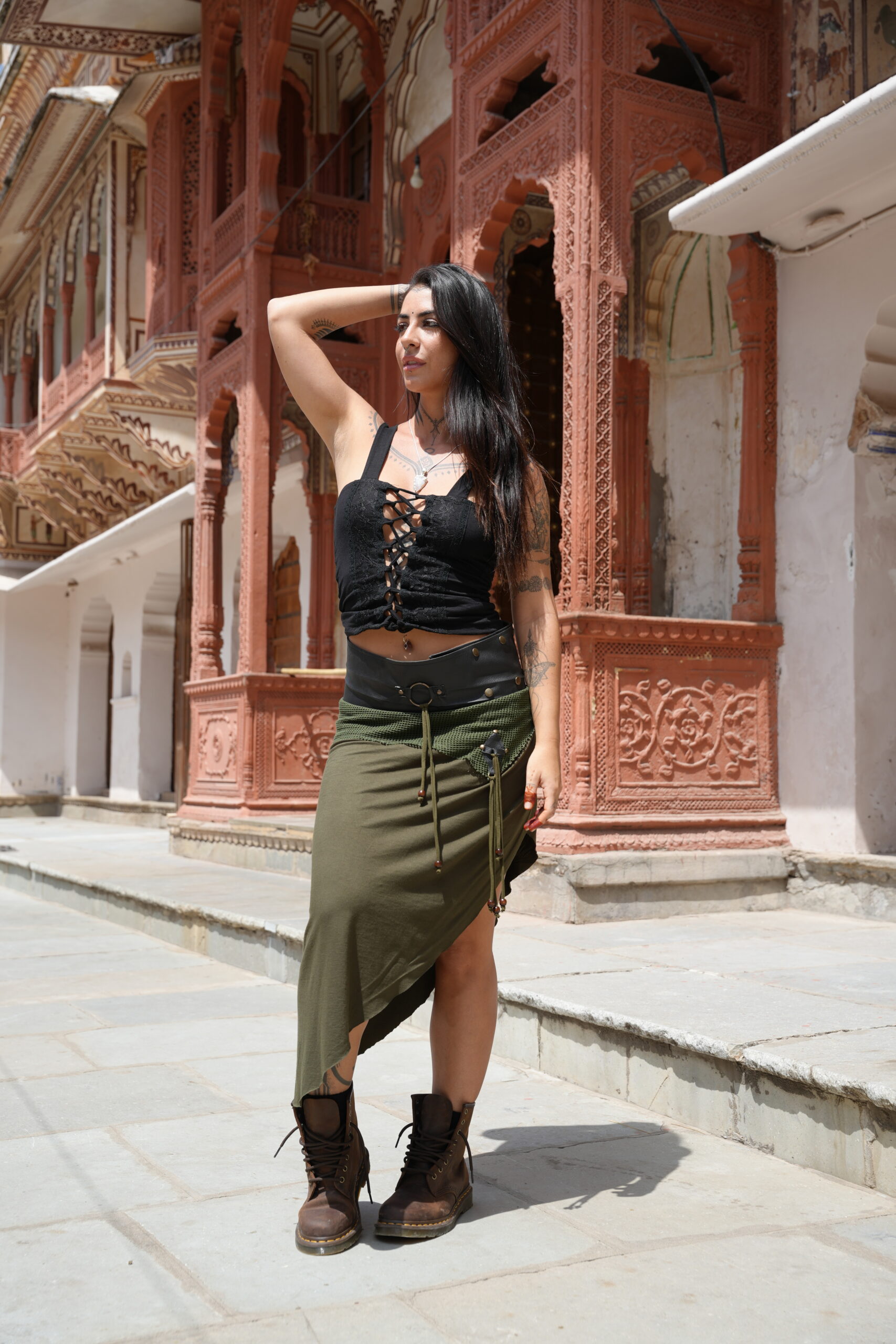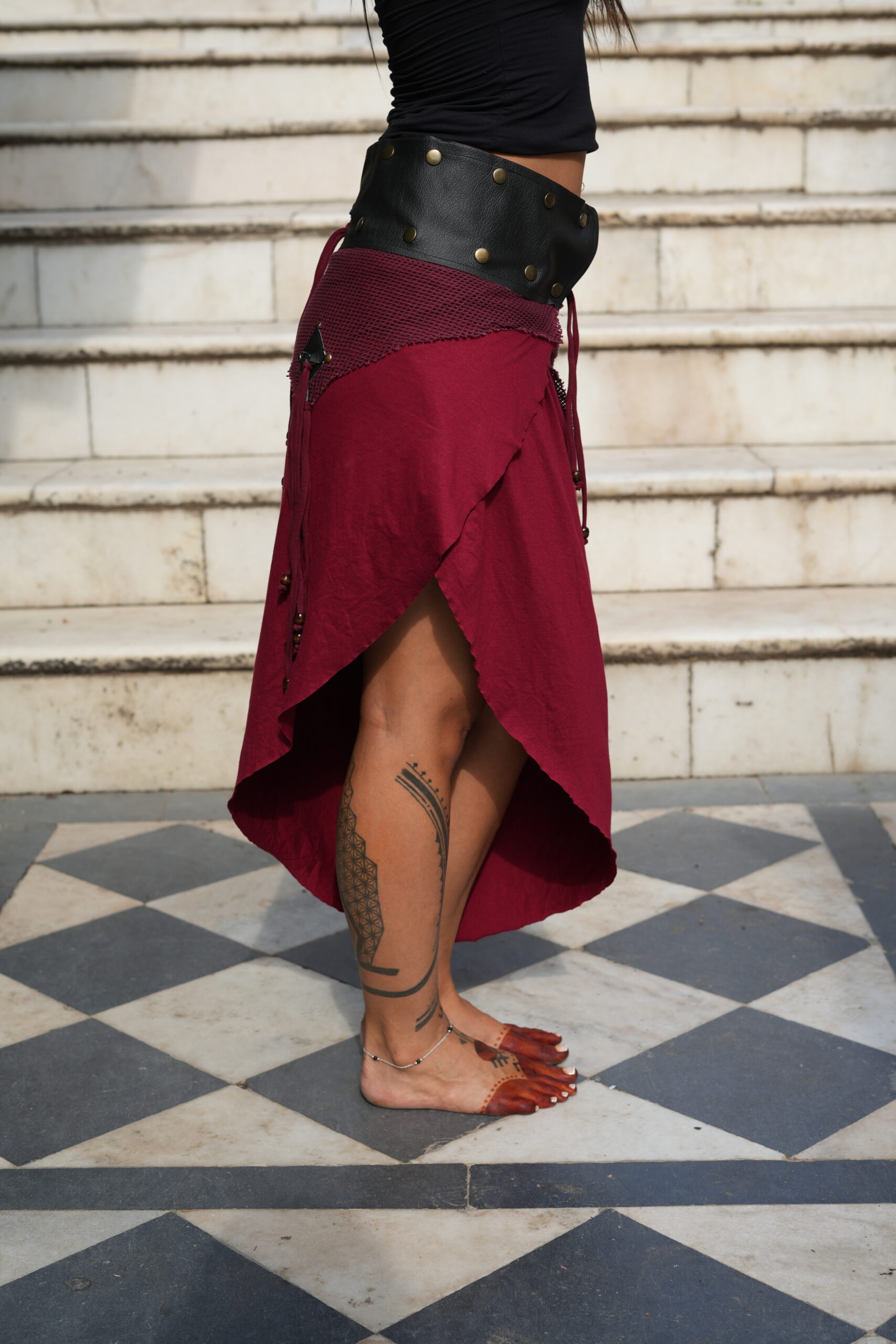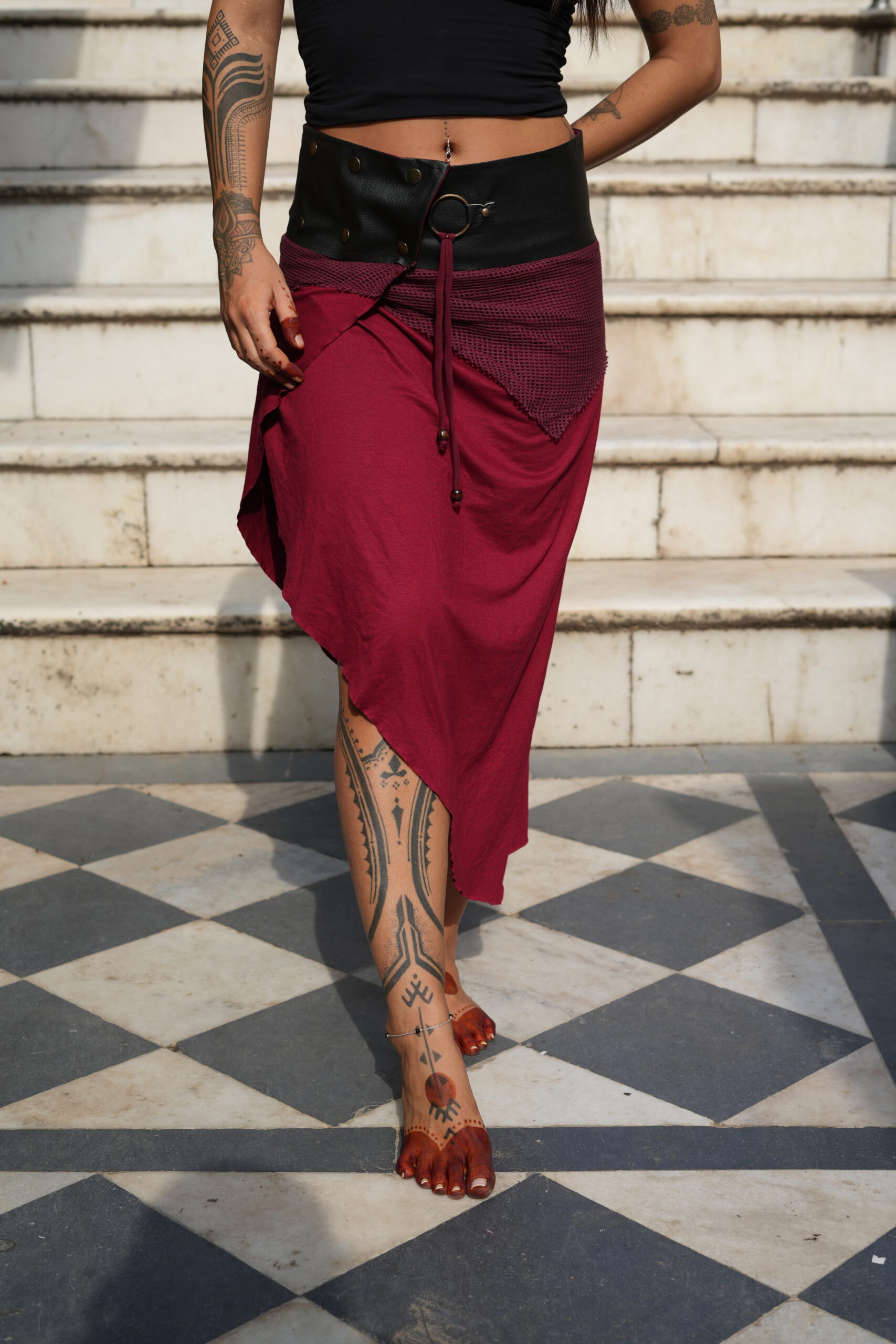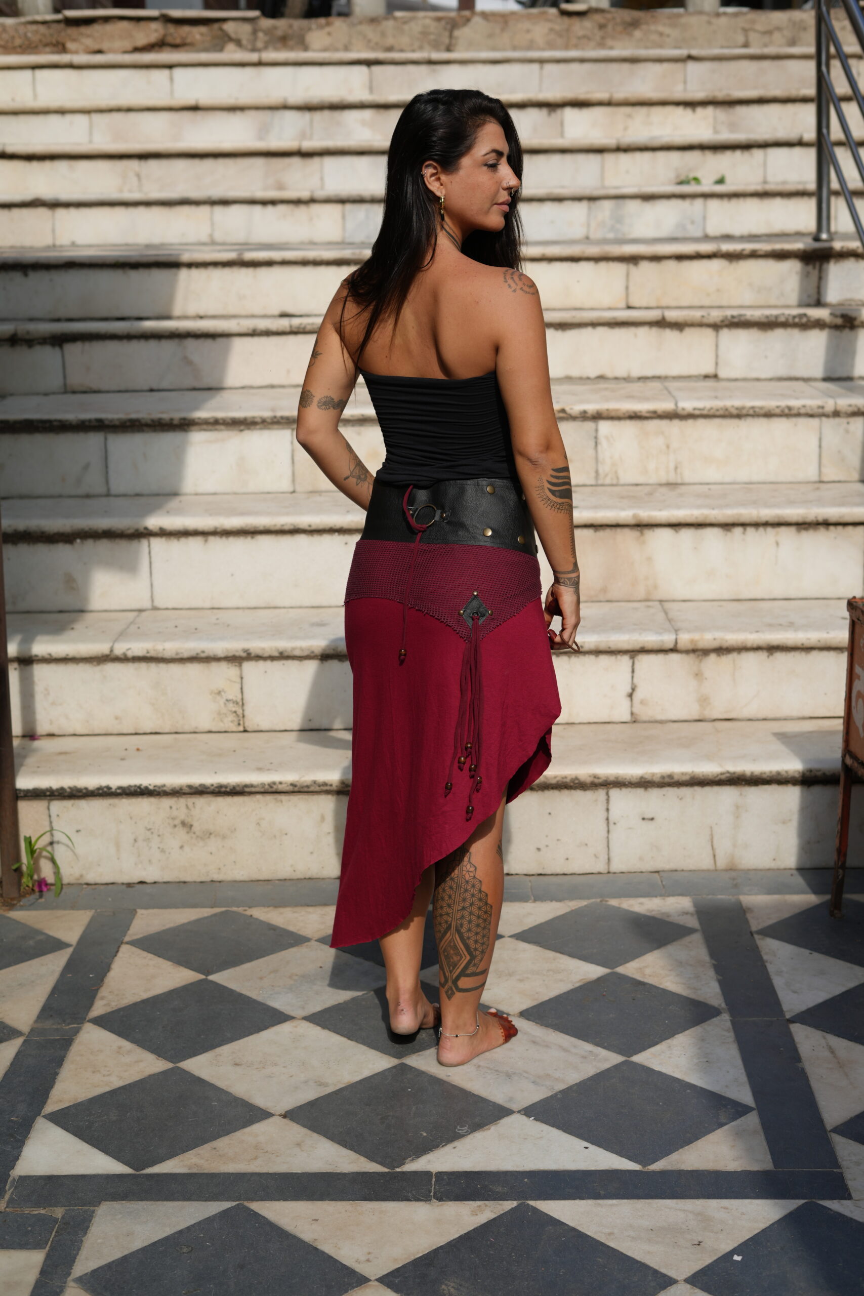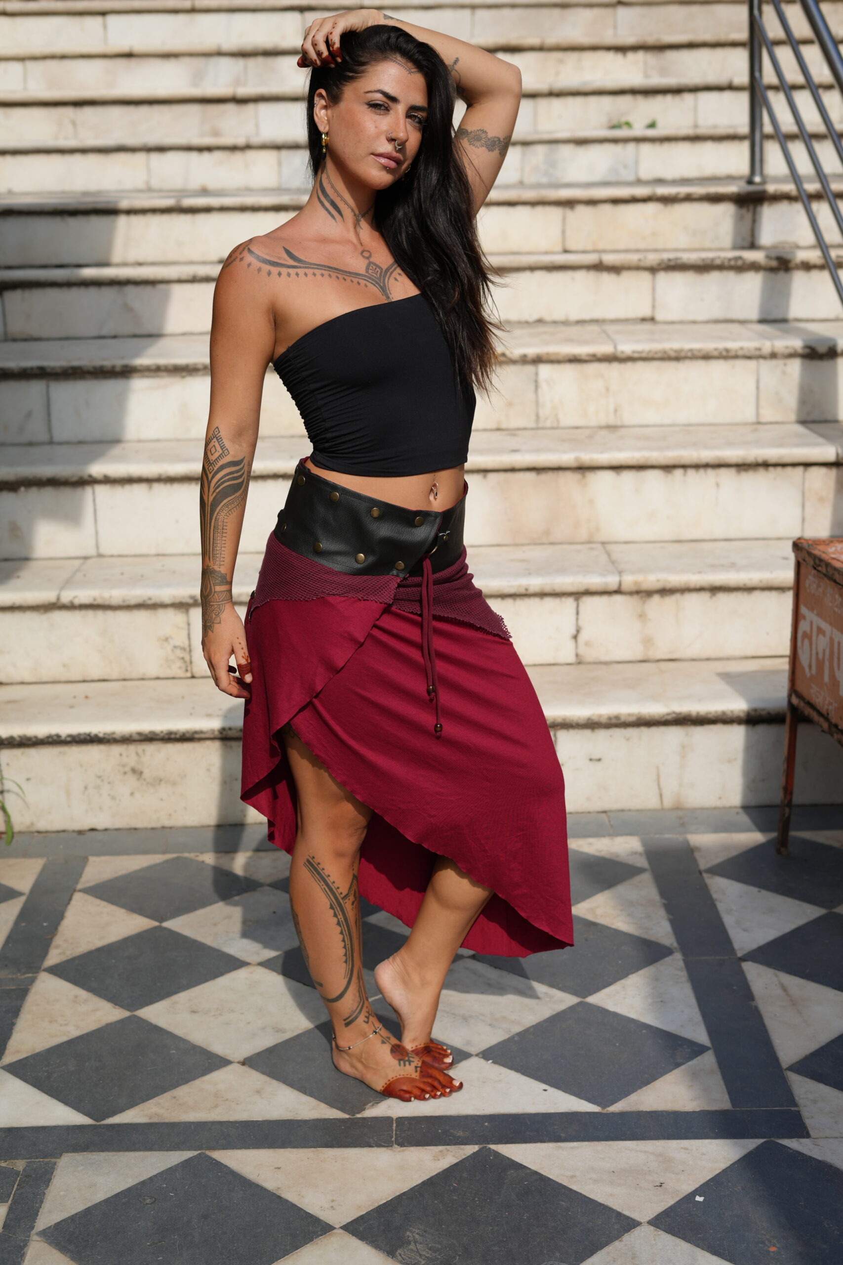 Saia midi bordô ou verde, com detalhes em couro. Tamanho único ajustável